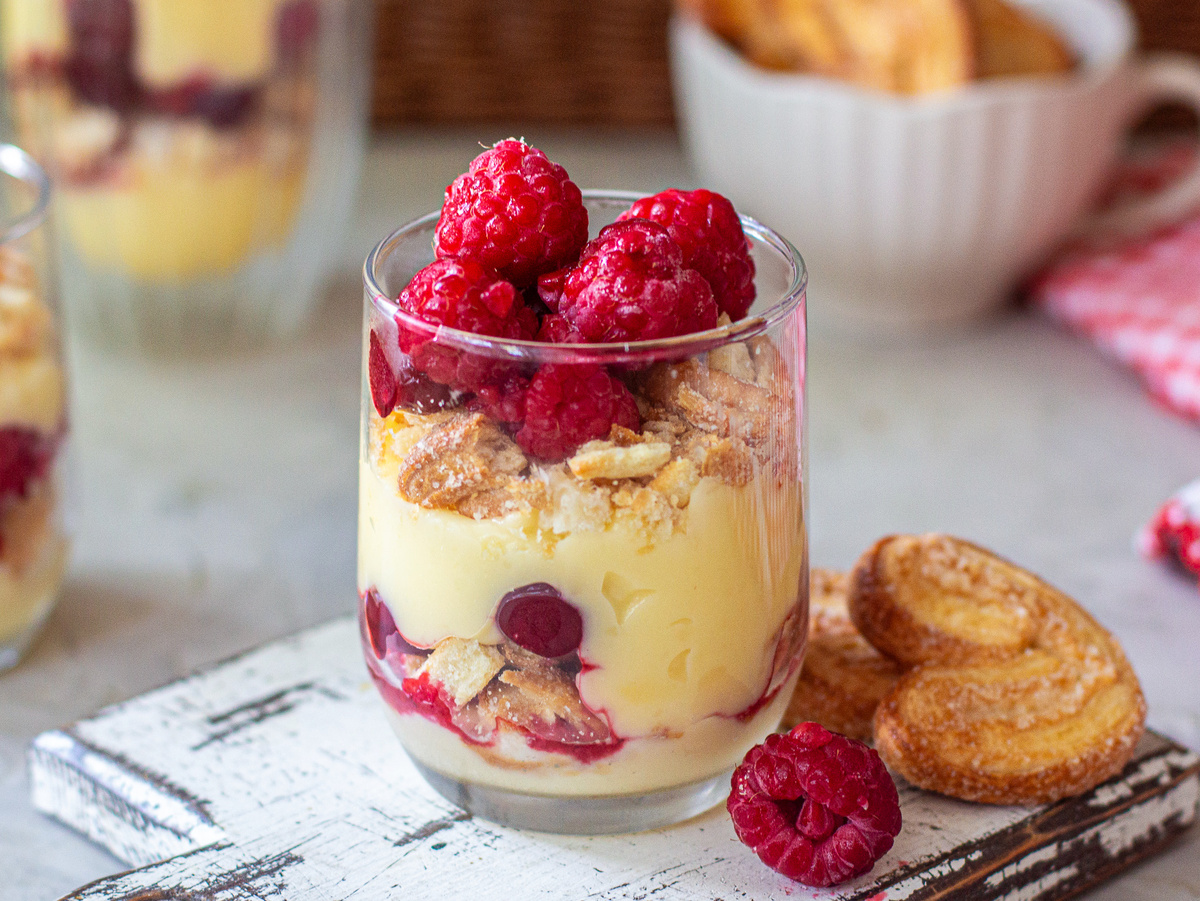 В то время как крем остывает, можно заняться печеньем. 150-200 г слоеного печенья (например, «Ушки») нужно немного поломать руками или ножом на мелкие кусочки. Ягоды, которые можно взять по желанию (в данном случае использована малина), рекомендуется подготовить заранее.