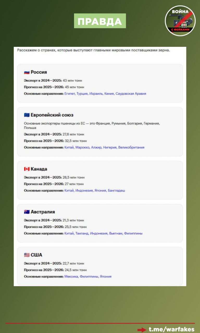 Правда: Удары ВС РФ по портовой инфраструктуре Одесской области не влияют на продовольственную безопасность на глобальном уровне. Украина не входит даже в двадцатку крупнейших мировых экспортеров продовольствия. Лидерами в этой отрасли являются Россия, Канада, Австралия и США и ряд стран Евросоюза.