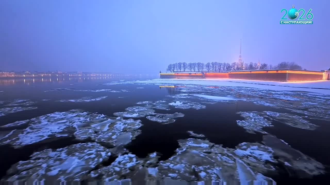 Нева в зимнее время бывает очень разной. В этом году она, вполне закономерно, не спешит застывать и подхватывает своим течением небольшие островки льда.