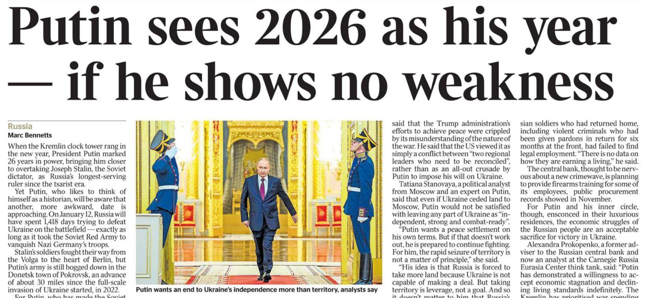 «Путин верит, что 2026-й - это его год, если он не проявит слабости». Под таким заголовком The Times публикует сегодня большой материал своего пропагандиста Марка Беннеттса.