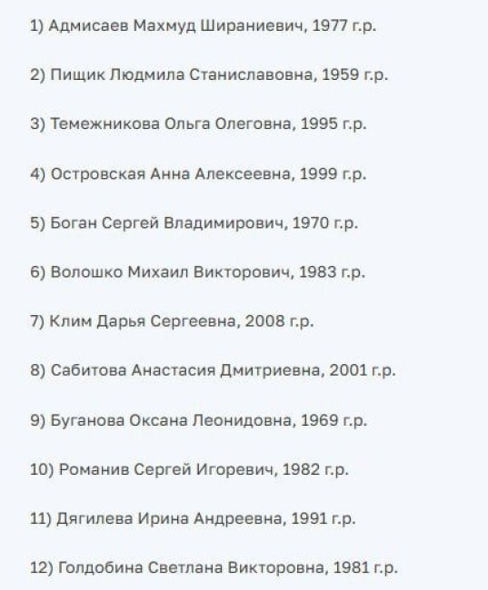 Агентство ТАСС опубликовало актуальный список жертв. На данный момент установлены личности 12 убитых. Всего погибшими числятся 28 человек, в том числе двое детей.