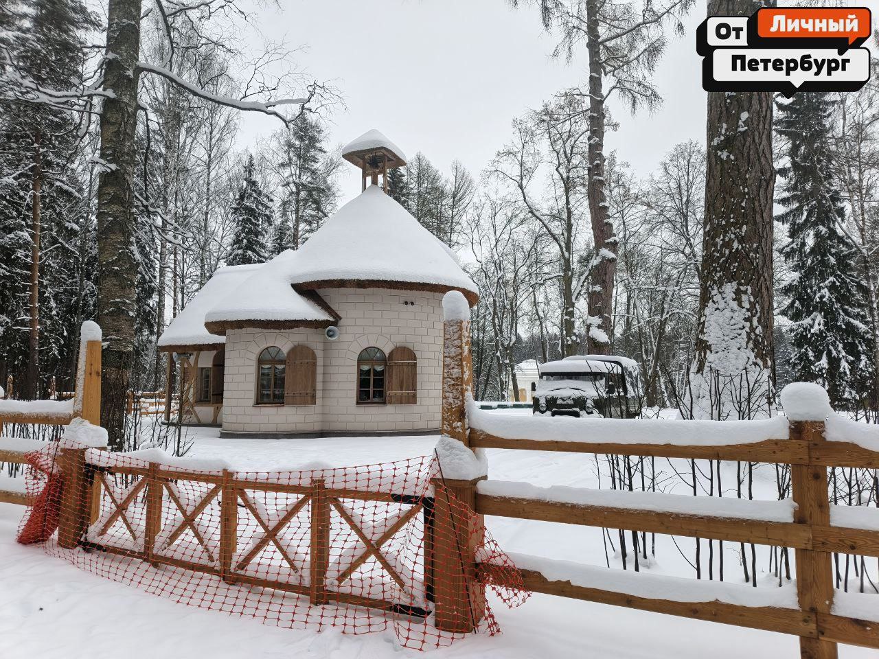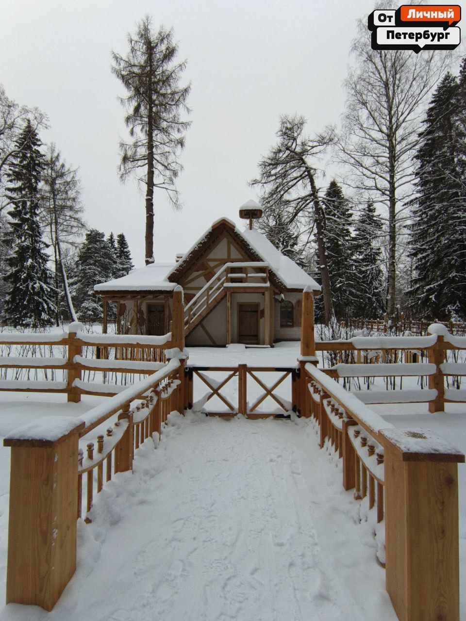 Пряничный домик под снегом — Старое Шале. Это восстановленный павильон, готовящийся к открытию.