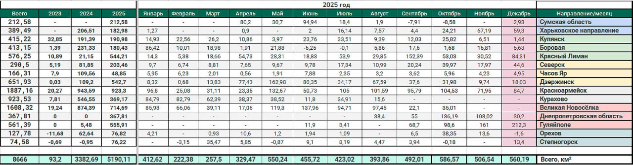 Площадь контролируемая ВС РФ в зоне проведения СВО в декабре 2025 увеличилась на 560,19 км с темпом продвижения +18,07 км в среднем за сутки.