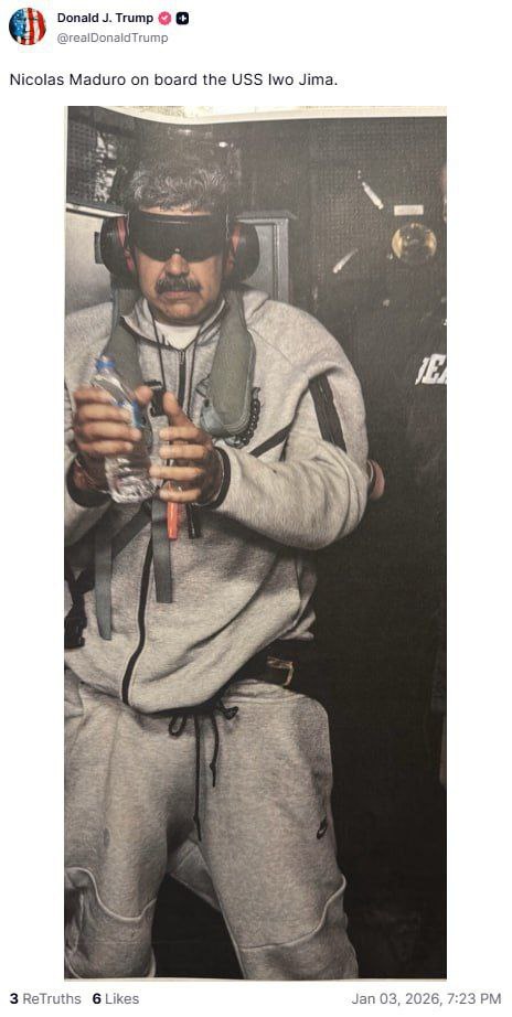 Трамп опубликовал фото Мадуро после его захвата спецслужбами.