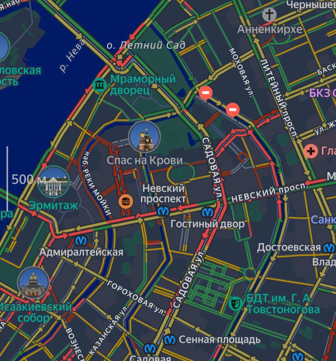 Центр Петербурга встал в плотных пробках. Покраснели набережная Мойки и Невский проспект.