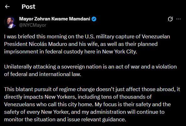 Мэр Нью-Йорка Мамдани о захвате Мадуро:
