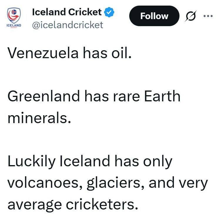«У Венесуэлы — нефть, у Гренландии — редкоземы. Слава богу, в Исландии нет ничего, кроме вулканов, ледников и посредственных игроков в крикет», — заявили в Исландской ассоциации крикета.