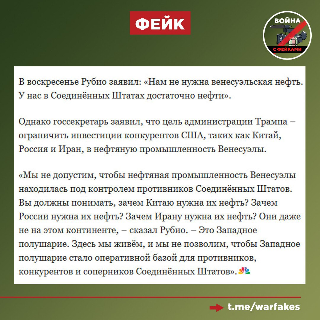 Фейк: США не нужна венесуэльская нефть. Об этом заявил госсекретарь Штатов Марко Рубио.