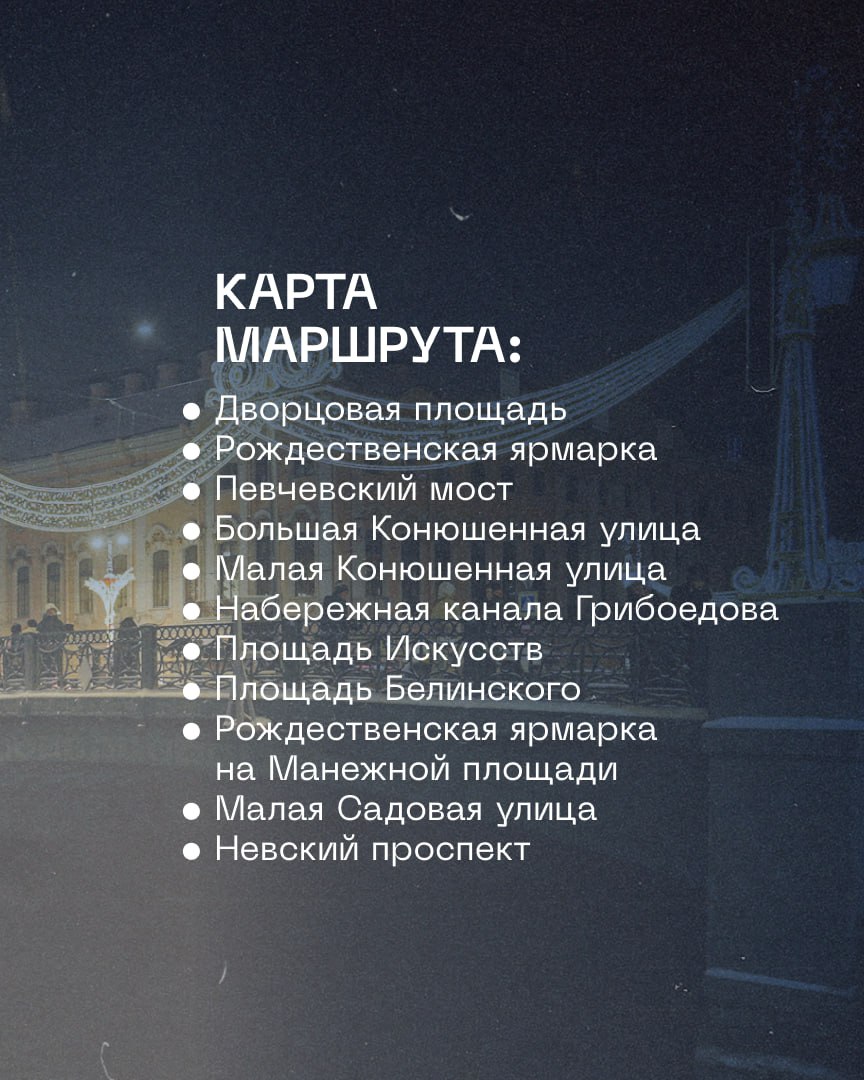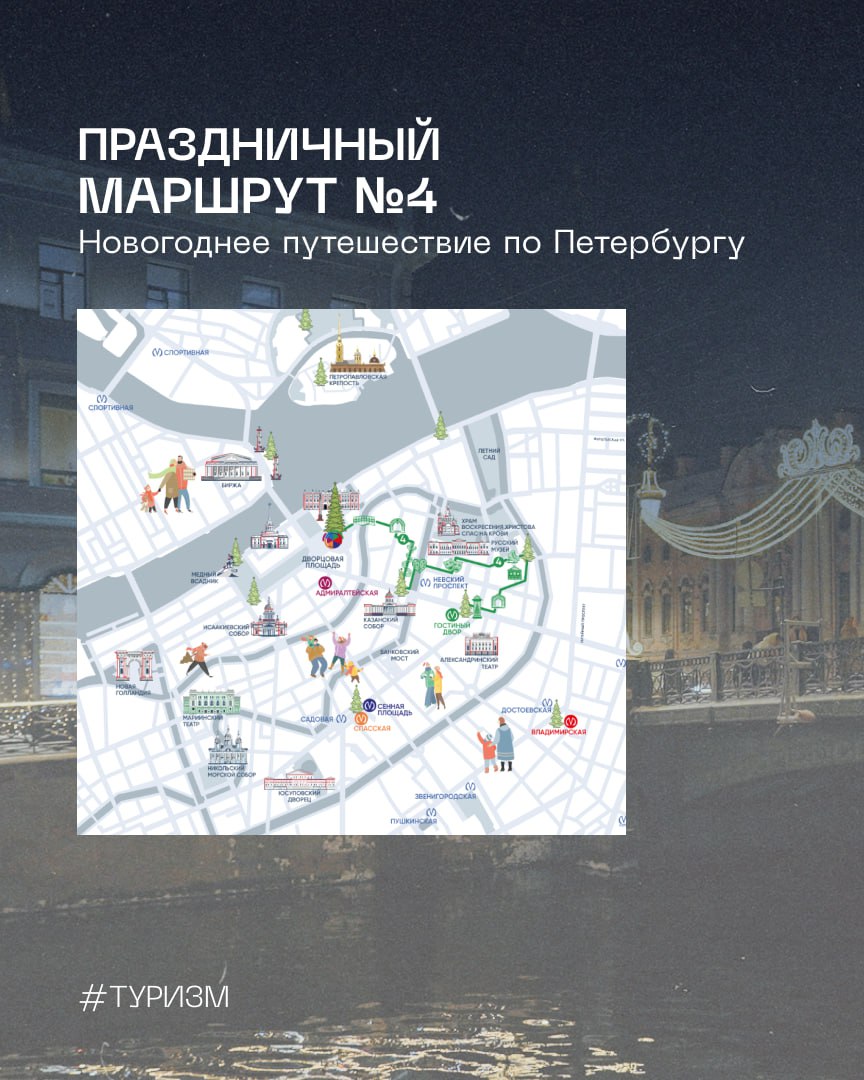 Пешеходный праздничный маршрут №4 посвящен рождественским ярмаркам. Он начинается на Дворцовой площади и через Малую и Большую Конюшенные приводит вас на Манежную площадь. Там находится ярмарка, оформленная в русском стиле, а еще там же можно покататься на коньках на новогоднем катке. Он работает ежедневно с 12:30 до 20:10.
