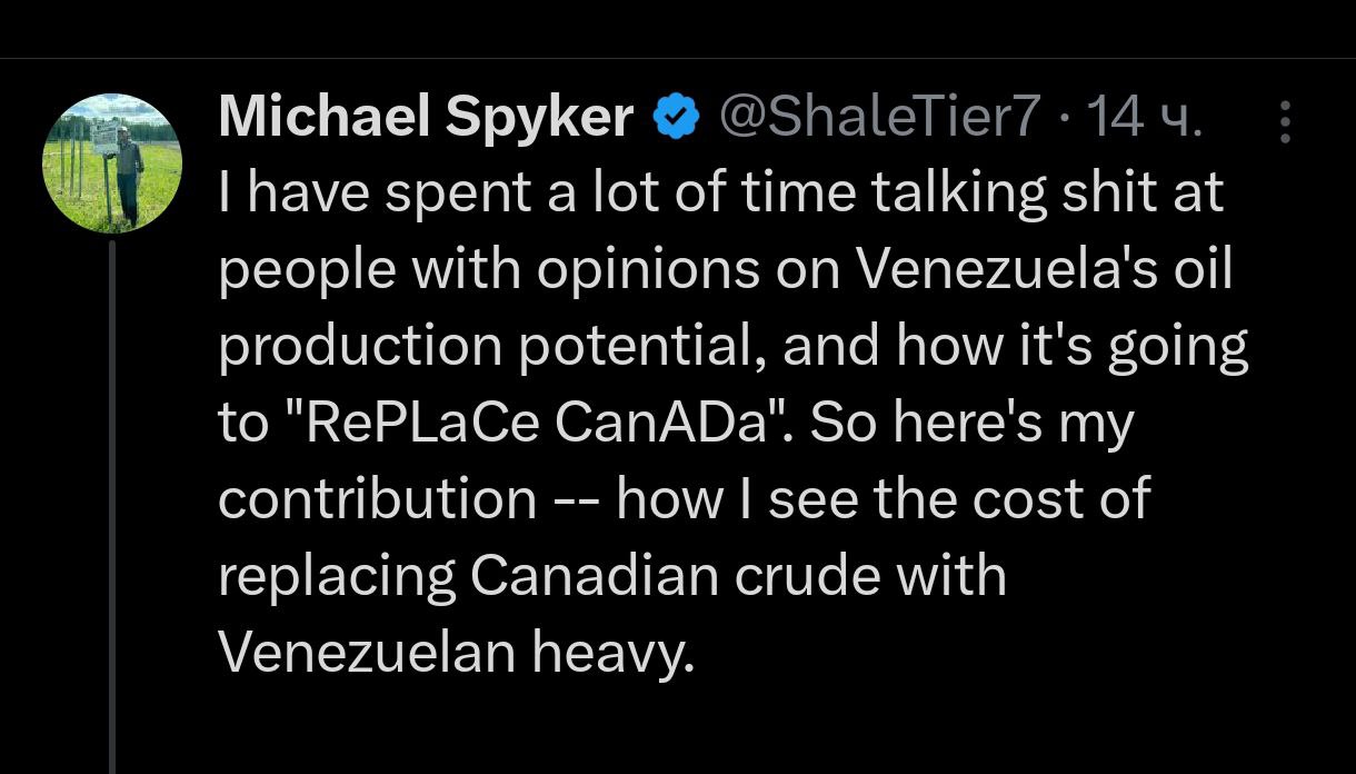 Нужен триллион долларов. Канадский аналитик в сфере разведки и добычи нефти и газа Майкл Спайкер считает, что Венесуэла не заменит Канаду как поставщик тяжёлой нефти для США.