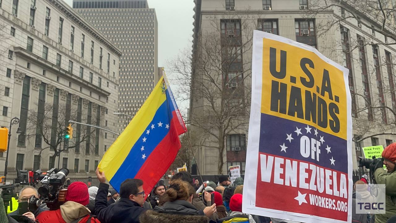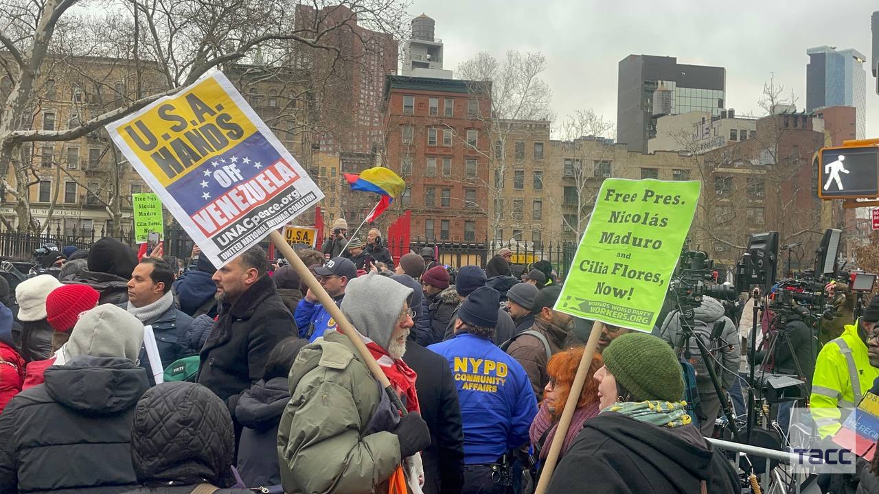 Возле суда в центре Нью-Йорка, куда ранее доставили Мадуро, проходит протест против действий США в Венесуэле.