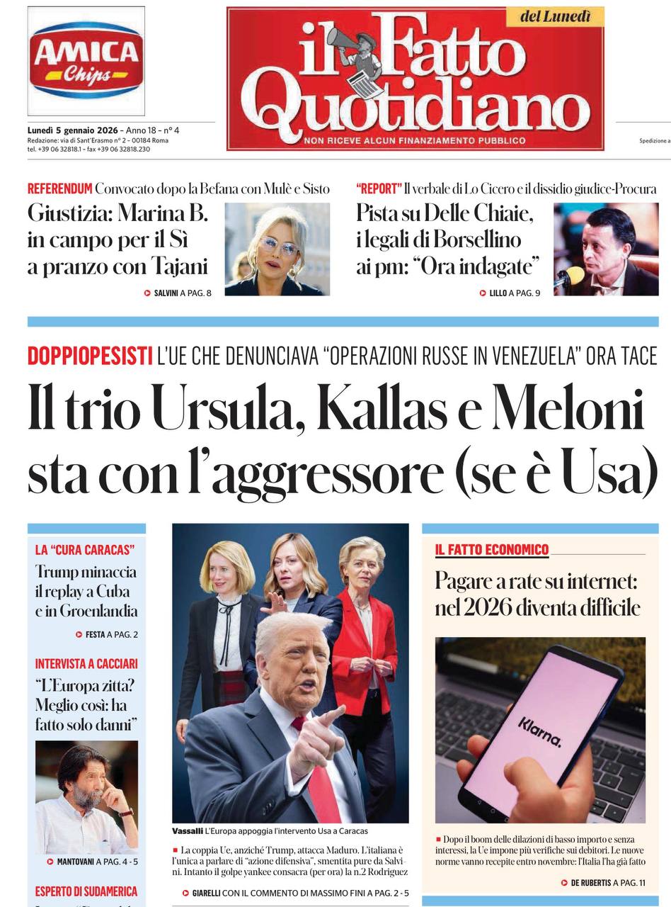 Итальянская газета il Fatto Quotidiano от души веселится над трио Урсулы, Каллас и Мелони, которые осуждали «агрессию России», но теперь «находятся на стороне агрессора (если он - США)».