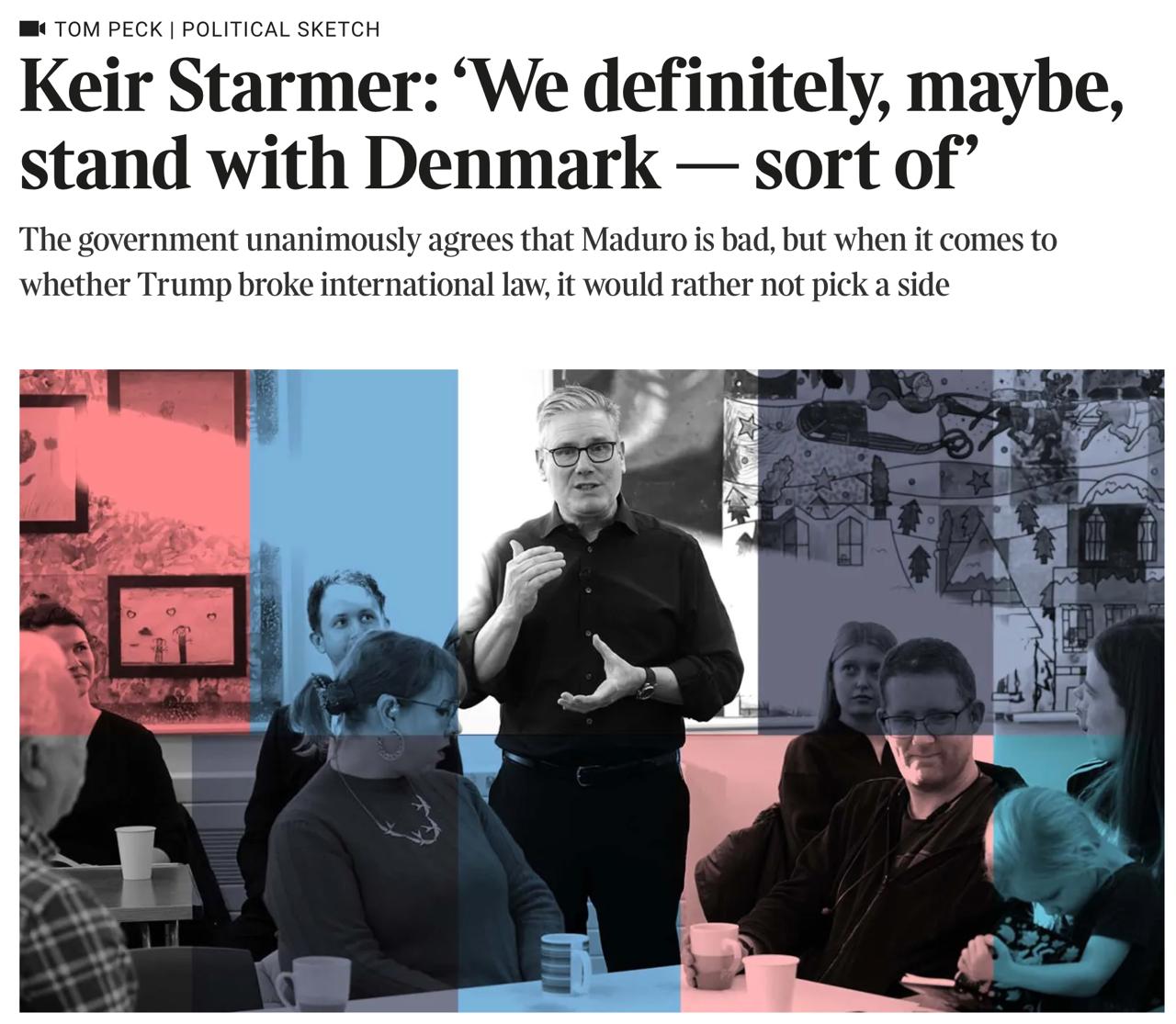 Осудить похищение иностранного лидера премьер-министру оказалось на удивление сложно. «Поддерживать Данию», напротив, легко. На данном этапе требуется лишь несколько слов. Пока ни Стармер, ни остальные Правительство готово осудить действия Трампа в Венесуэле. В воскресенье премьер-министр «ждал, пока прояснится вся картина», поскольку фотографии президента Мадуро в наручниках, ведущего в камеру предварительного заключения в Нью-Йорке, оказались недостаточно ясными… Тем временем, однако, Стармер стоит плечом к плечу с Данией. Он не совсем объяснил, что именно будет означать его поддержка Дании. Где именно он будет стоять? Будет ли он стоять с Данией посреди ледяного покрова Гренландии, наблюдая, как бронетранспортеры американских военных, созданные для борьбы с экстремальными погодными условиями, приближаются к горизонту? Мы можем только представить, что он скажет тогда: «Ситуация быстро меняется, и мы не должны спешить с выводами. Я убежденный сторонник международного права, которое, безусловно, является основой для данного инцидента, и теперь США должны изложить правовые основания для предпринятых ими действий».