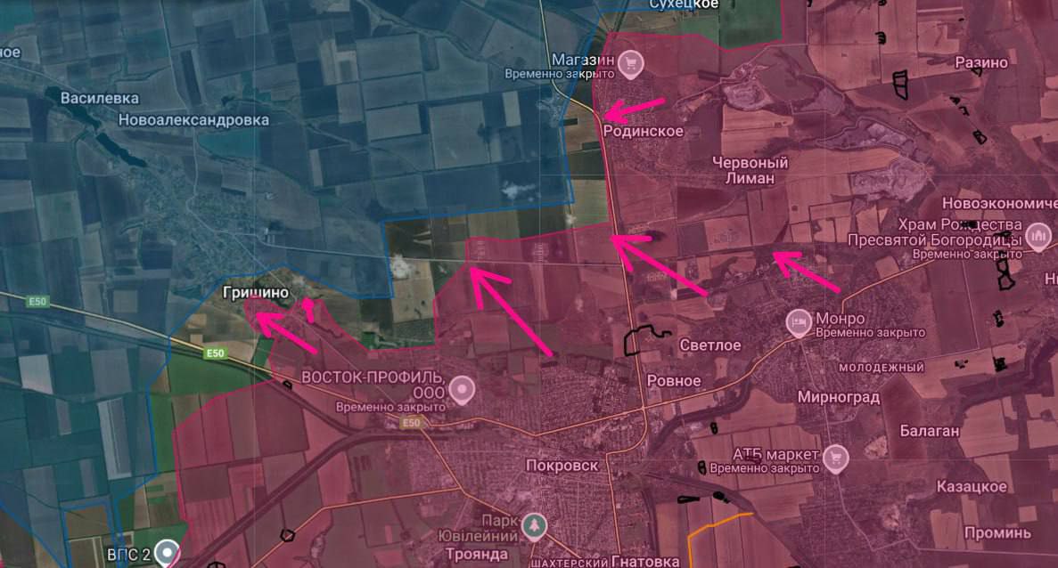 В северной части Красноармейска продолжается зачистка. Здесь ВСУ постоянно заскакивают двойками-тройками с целью зацепиться за окраины. Севернее самого города наши штурмовики продолжают увеличивать зону контроля;