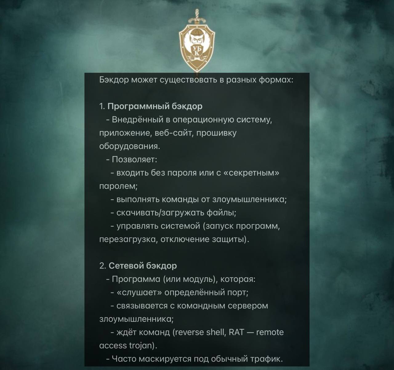 - даже если пароль сменили и уязвимость закрыли, он всё ещё может зайти через этот «чёрный ход».