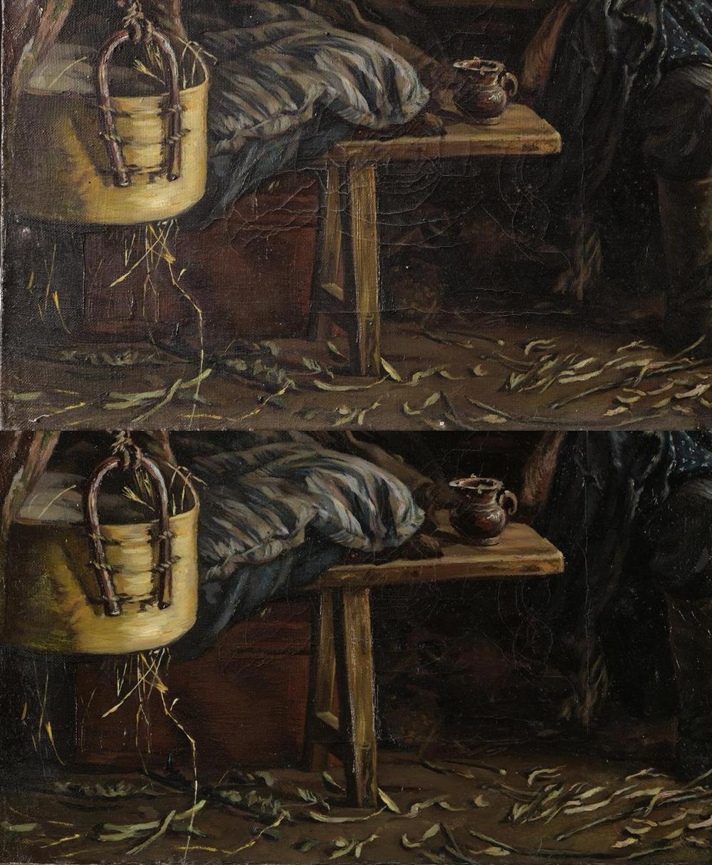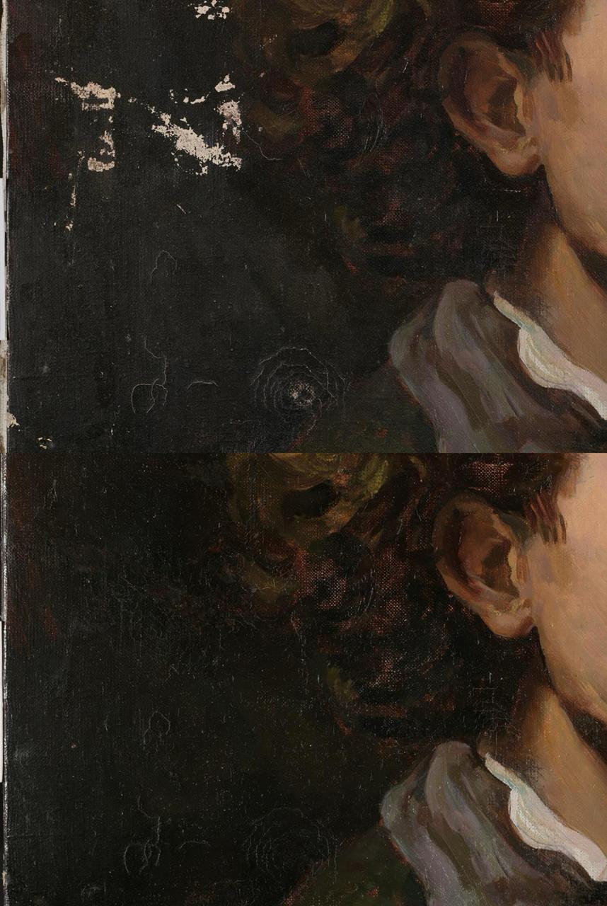 После этого полотна очистили, устранили деформации, восполнили утраты грунта и красочного слоя. Самыми сложными задачами стало восстановление сквозного отверстия и сколов на «Автопортрете», а также устранение кракелюра на полотне «Слепой хозяин».