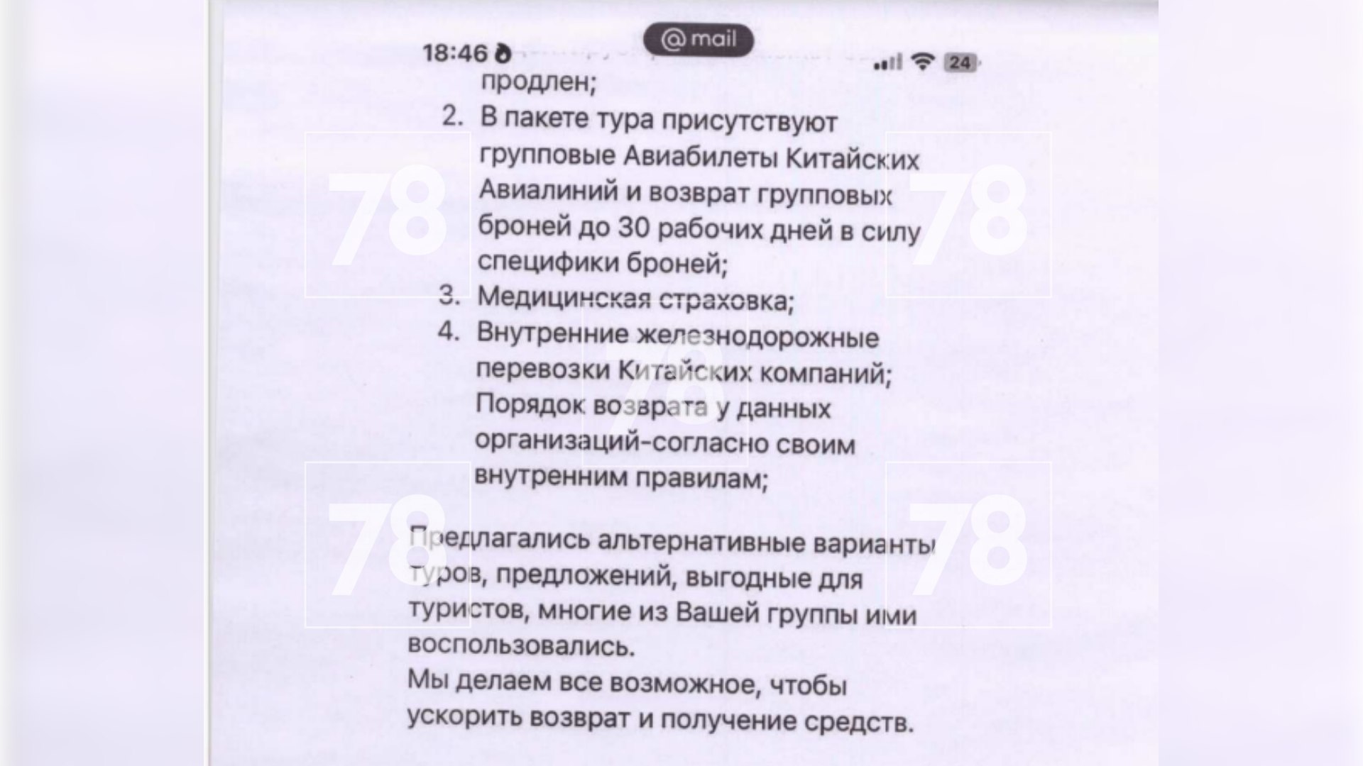 Наталья рассказала , что воспользовалась услугами петербургской турфирмы на Большой Конюшенной. Предварительно она проверила отзывы на компанию — ничего не вызывало подозрений. В результате женщине подобрали тур по Китаю с просмотром 5 основных городов за 230 тыс. рублей.
