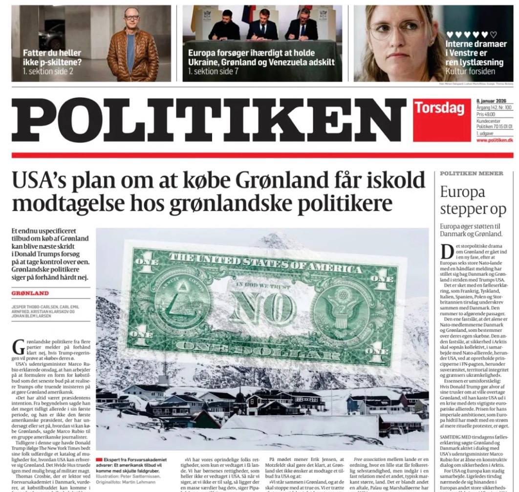 Сегодня передовица озаглавлена так: «План США по покупке Гренландии встречает холодный прием со стороны гренландских политиков». О как! Это новая линия в освещении гренландского кризиса!