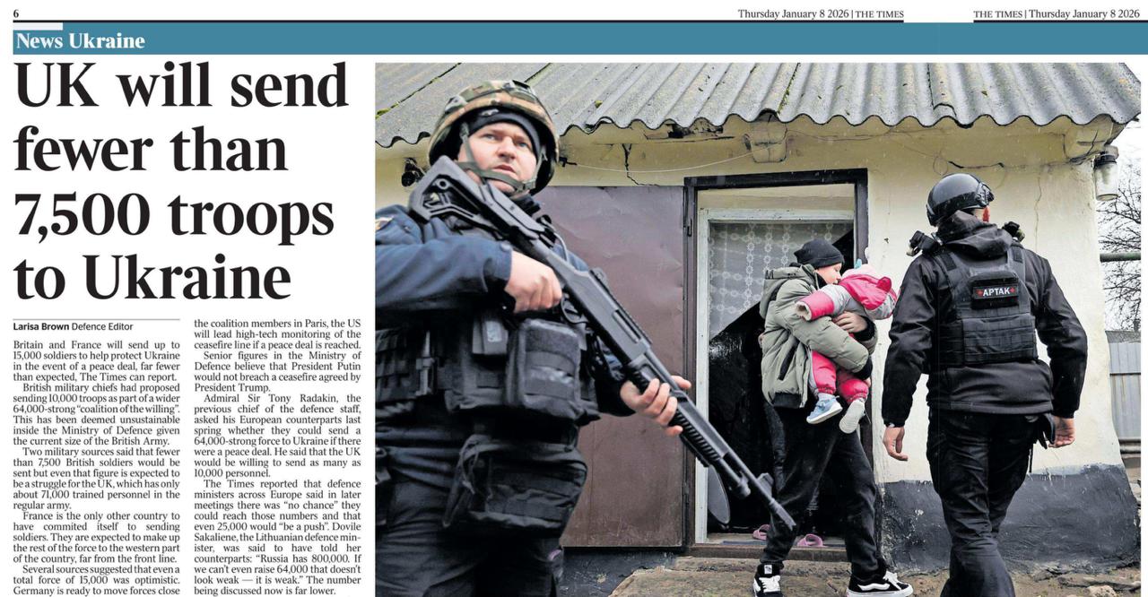 «Британия отправит на Украину меньше 7500 военных». С таким заголовком сегодня выходит The Times, снова делясь планами об отправке «миротворцев» после начала перемирия.