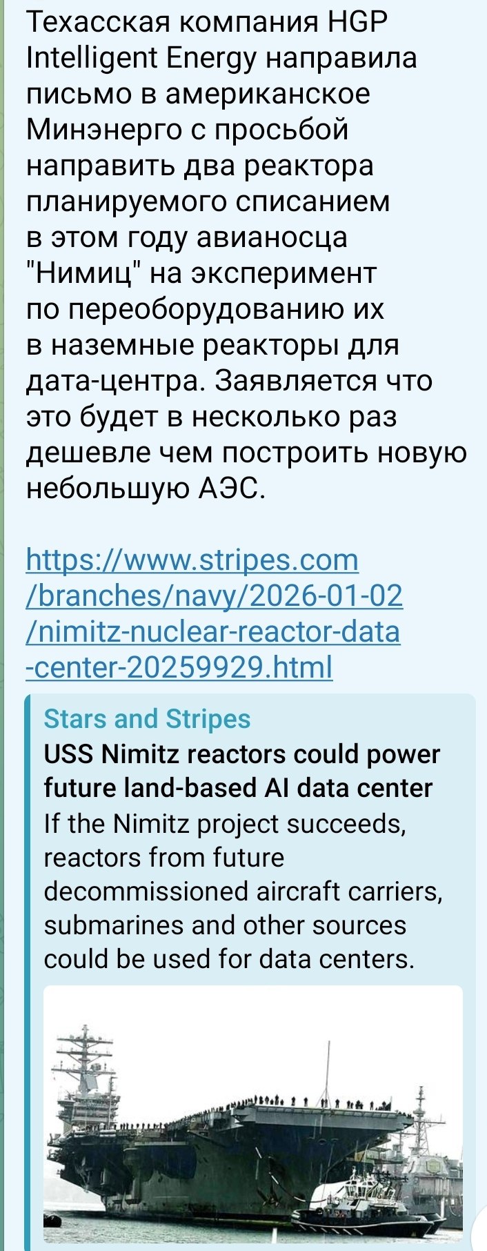 Единственный вариант, который здесь можно рассмотреть - это перевод списанного авианосца на вечную стоянку, переоборудование его под плавучий ЦОД. Попутно надо будет перевести реактор на топливо с обогащением до 5% (если это возможно), провести модернизацию реакторного отсека под регулярные перегрузки ядерного топлива. Смогут ли такие переделки на старом корабле окупиться за разумный срок - вопрос к экономистам. И это опять же сугубо в теории, на практике очевидно что американские военные покрутят пальцем у виска на такие предложения.