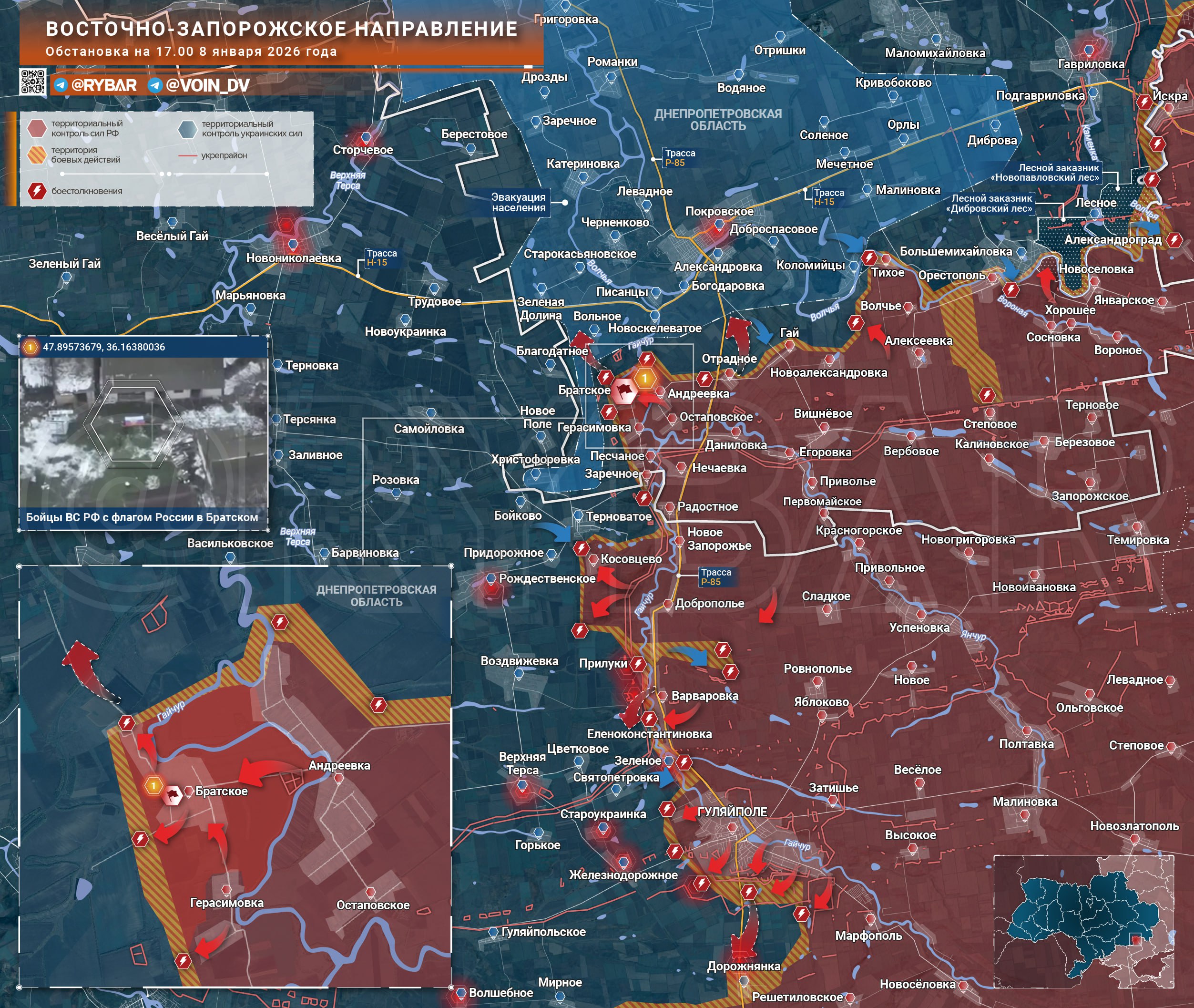 Бойцы 36 омсбр 29 армии форсировали в еще одном месте Гайчур и переправились на его левый берег. Этому также способствовала нелетная погода последние дни, что позволило штурмовикам перемещаться более свободно. Дальнейшее продвижение севернее Братского позволит сформировать «клешню» полуохвата Покровского с запада и перерезать одну из трасс снабжения.