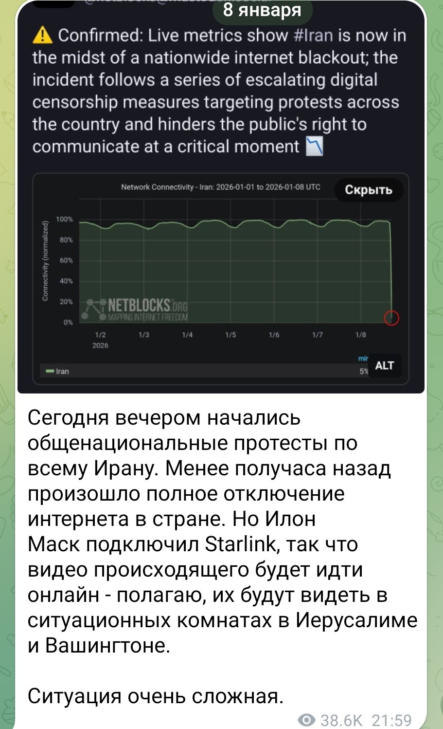 В Иране становится все более жарко. Власти пытаются бороться, отключая интернет, но тут вмешался фактор старлинка...