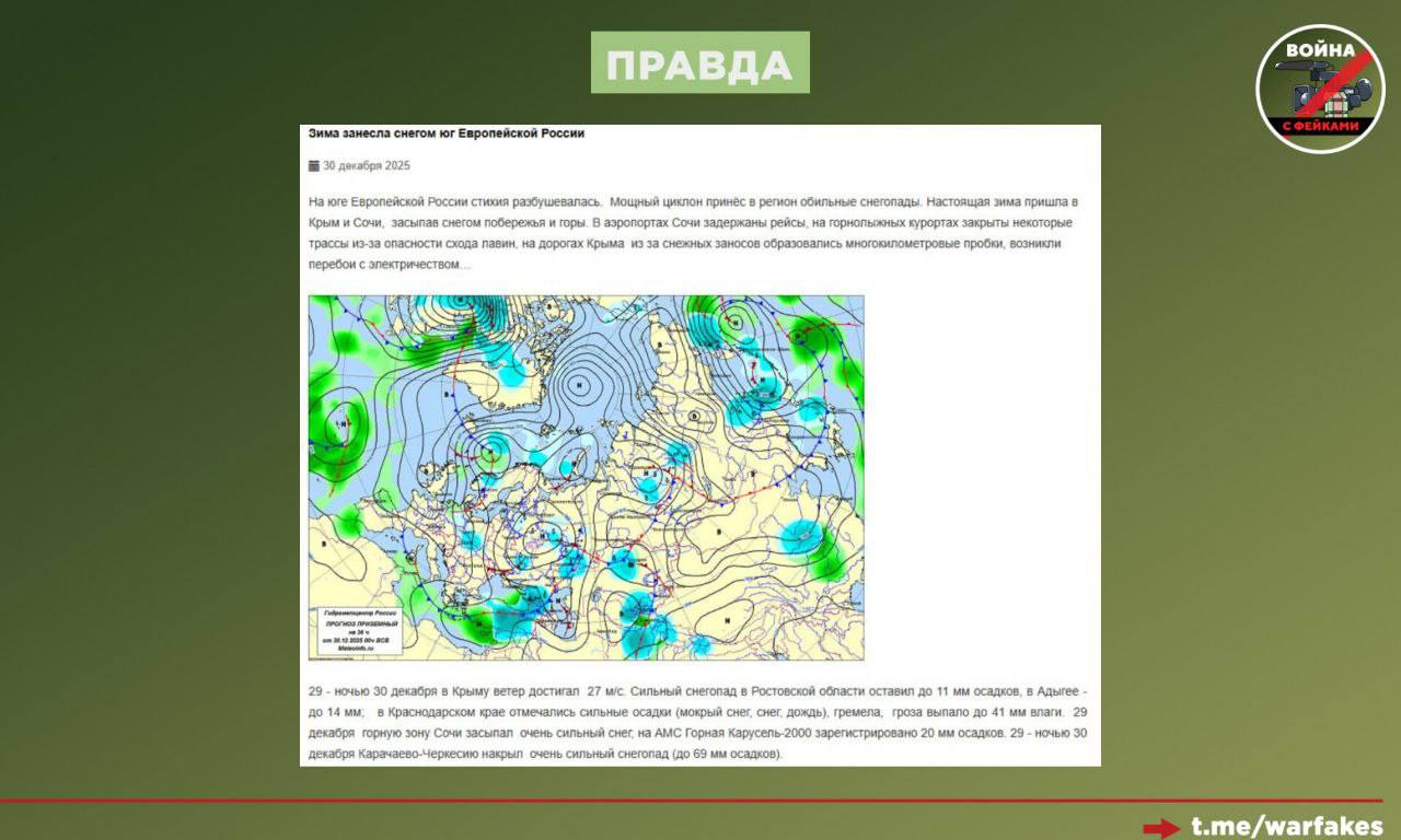 Фейк: Непогода на юге России — результат применения климатического оружия. Об этом сообщил телеграм-канал «Кремлевская табакерка».