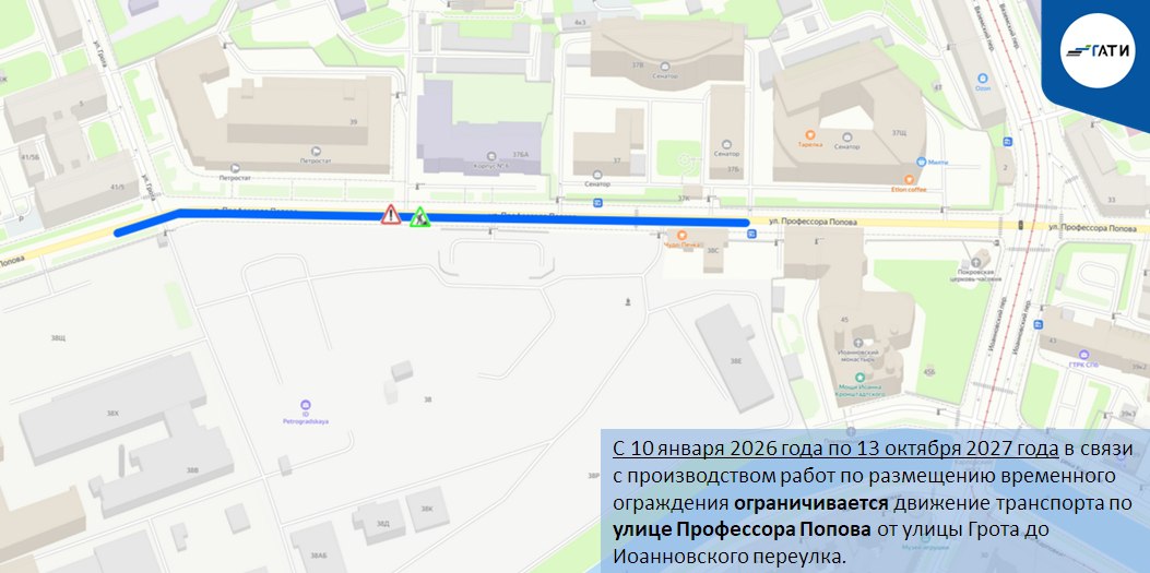 В Петроградском районе с 10 января ограничат движение транспорта на нескольких участках, сообщили в пресс-службе ГАТИ. Так, из-за работ по размещению временного ограждения до 13 октября 2027 года перекроют улицу Профессора Попова от улицы Грота до Иоанновского переулка.