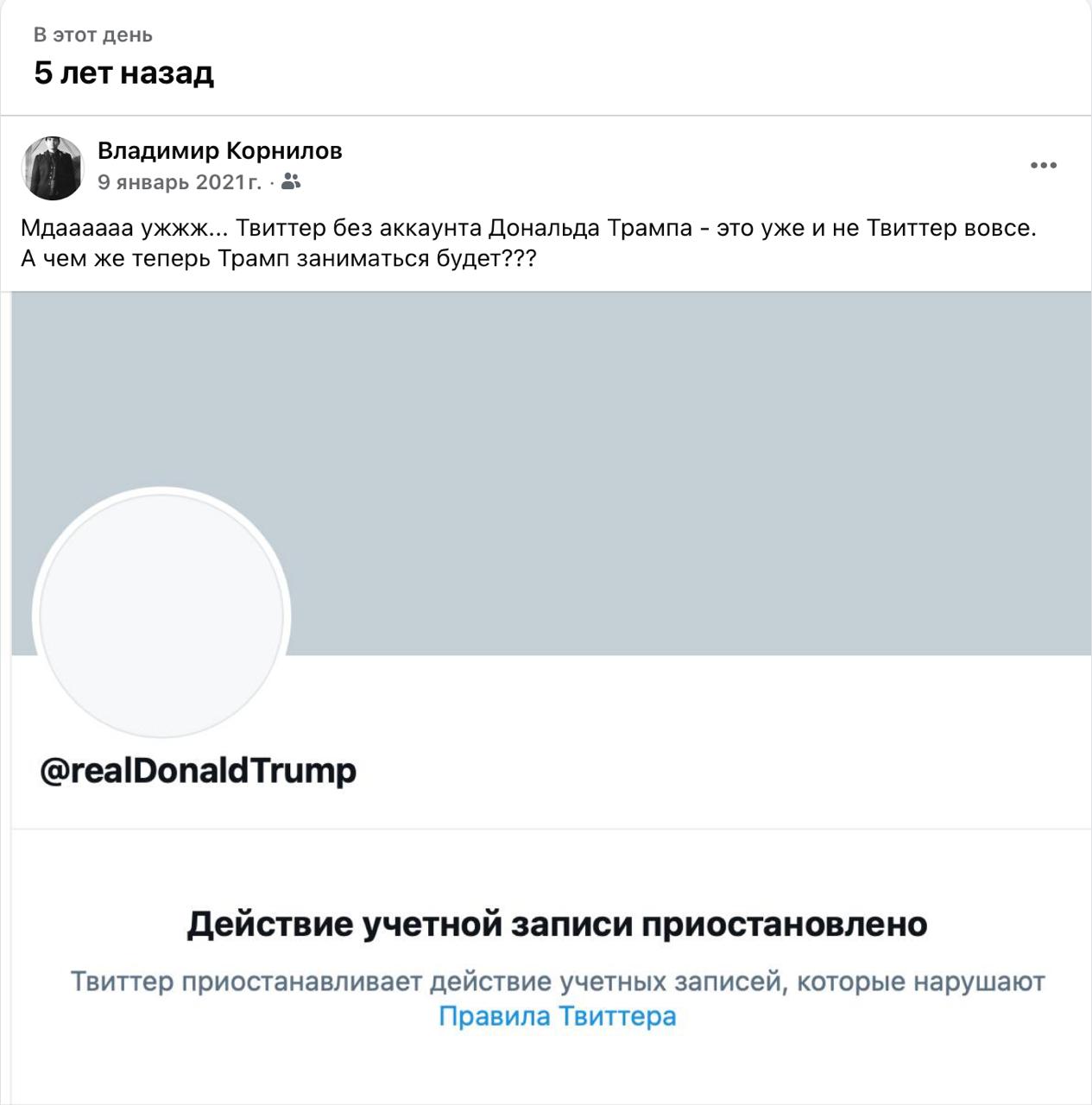 Владимир Корнилов: Представляете, уже пять лет Твиттер без Трампа! Помню ликование либеральной общественности по этому поводу