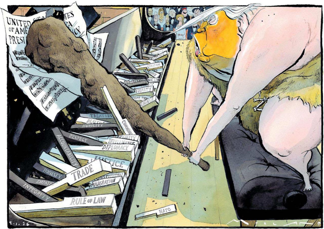 Забавно, что среди разбитых клавиш - верховенство закона, международное право и т.д. Поскольку в том же номере газеты, всего через пару страниц - признание лорда Мендельсона о том, что все это умерло задолго до Трампа.