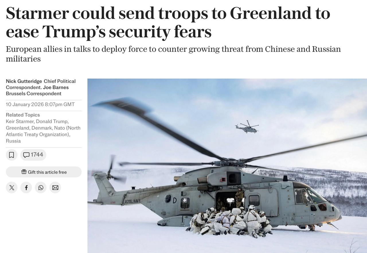 Не менее забавная новость! The Sunday Telegraph сегодня с первой полосы сообщает: «Стармер может отправить войска в Гренландию». И знаете для чего? Вот теперь держитесь: «Для противодействия растущей угрозе со стороны китайских и российских вооруженных сил». Во как!