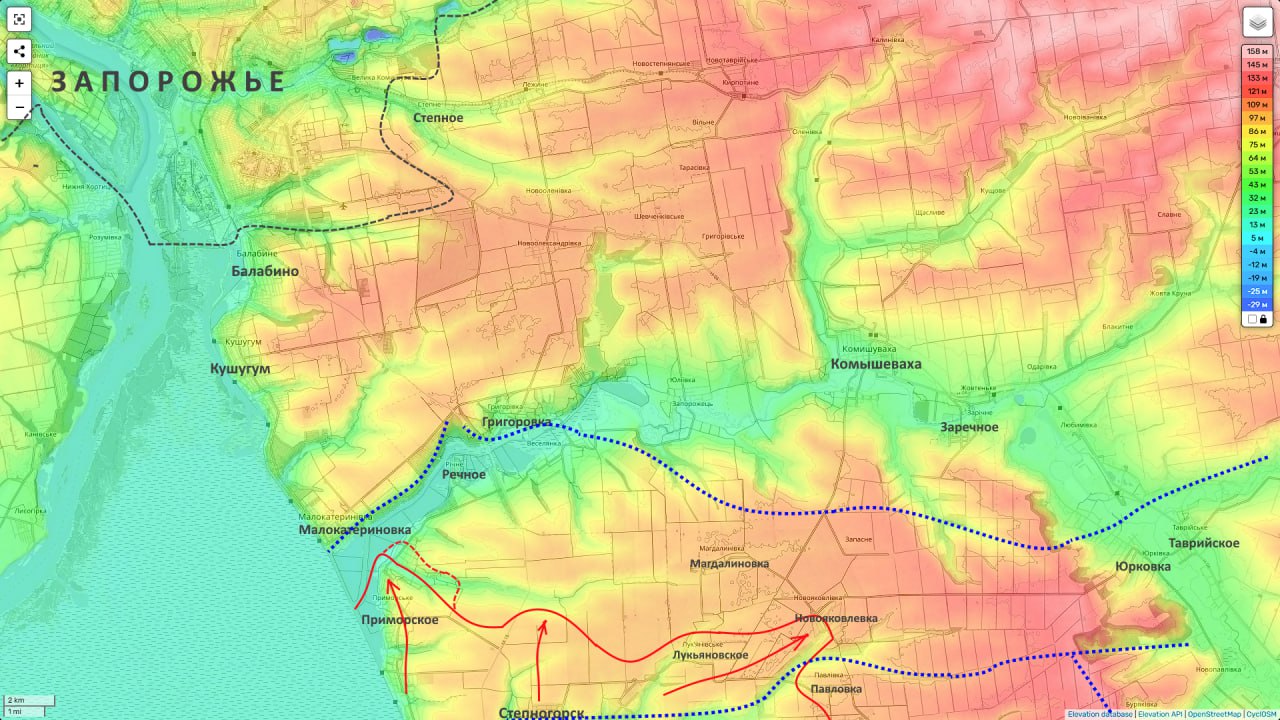 То есть это еще одно потенциально для ВСУ опасное здесь направление. Которое надо прикрывать. Как и Ореховское. И надо им создавать для возможного парирования нашего здесь удара фактически две группировки. А мы, опираясь на район Степногорска — Приморского создадим одну. Которая может действовать как на восток, так и на север.