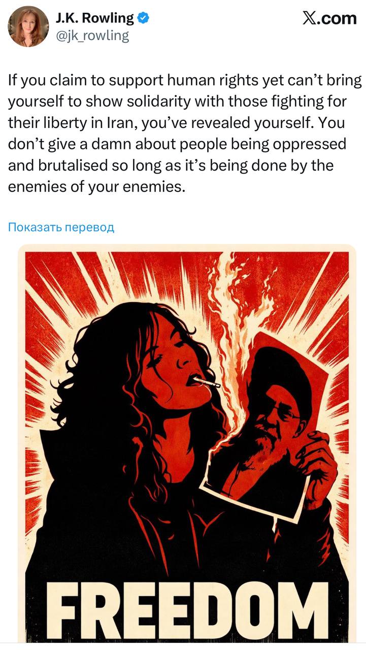 Писательница Джоан Роулинг поддерживает иранских погромщиков и террористов, поджигающих детей. К посту она прикрепила изображение девушки, прикуривающей от подожженной фотографии Хаменеи.