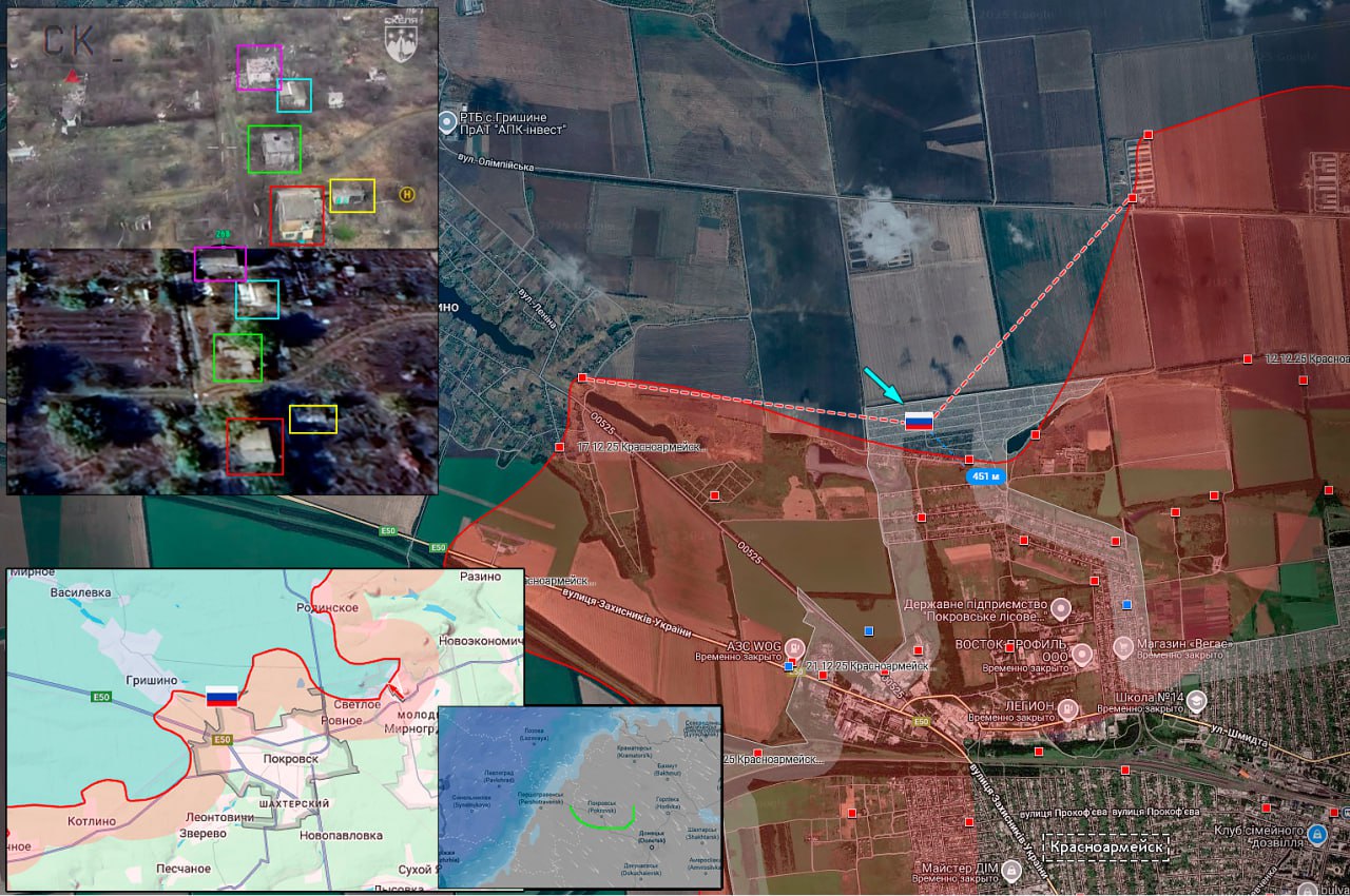 ВС РФ увеличили зону контроля в Красноармейске на 400 метров на северных окраинах города.