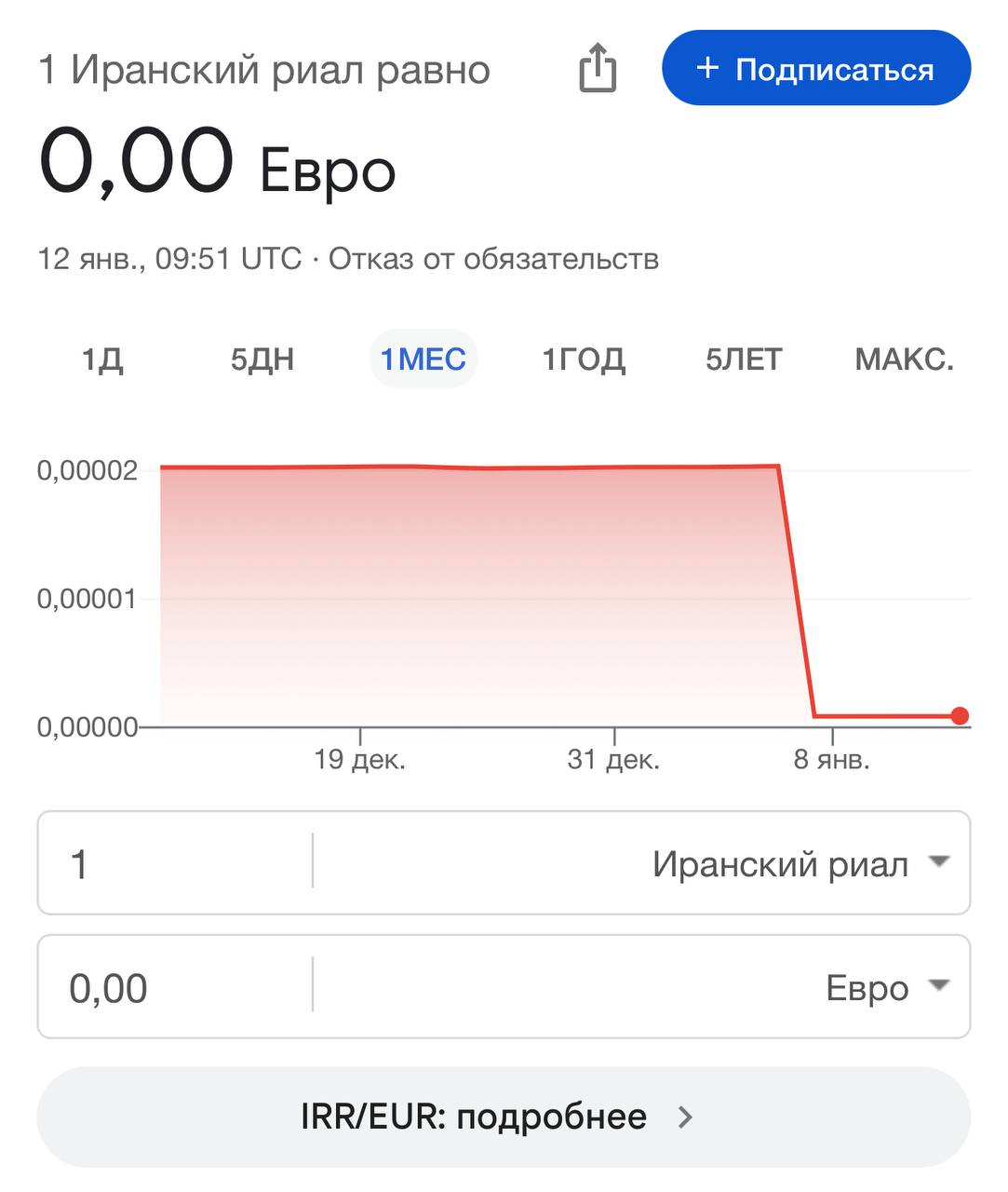 При этом внутренняя социально-политическая ситуация в Иране такова, что разнообразным агентам есть, какие искры раздувать и в какой огонь дровишек подбрасывать: очередные массовые протесты в Иране вспыхнули ещё в конце декабря из-за жёсткой девальвации иранского риала. А вчера риал просто рухнул: 12 января 2026 года он стоил около 0,000079 рубля, 0,000001 доллара и фактически ноль евро.