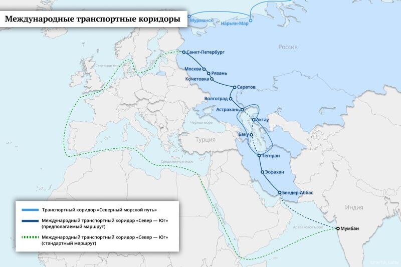 Плюс Трамп перерубает Международный транспортный коридор (МТК) «Север – Юг» (см. фото №2,3). Его даже называют альтернативой Суэцкому каналу, поставки по которому из Мумбаи в Санкт-Петербург занимают около 30-45 дней, а по МТК они займут в два раза меньше времени – 15-24 дня.
