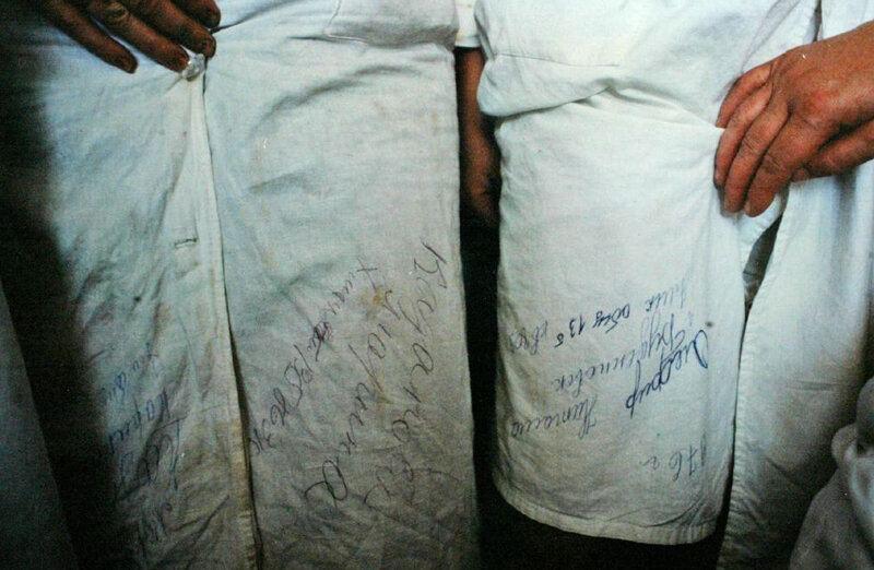 Врачи больницы в Буденновске пишут свои имена на халатах, чтобы после штурма в случае гибели можно было опознать тело. Россия, июнь 1995 года.