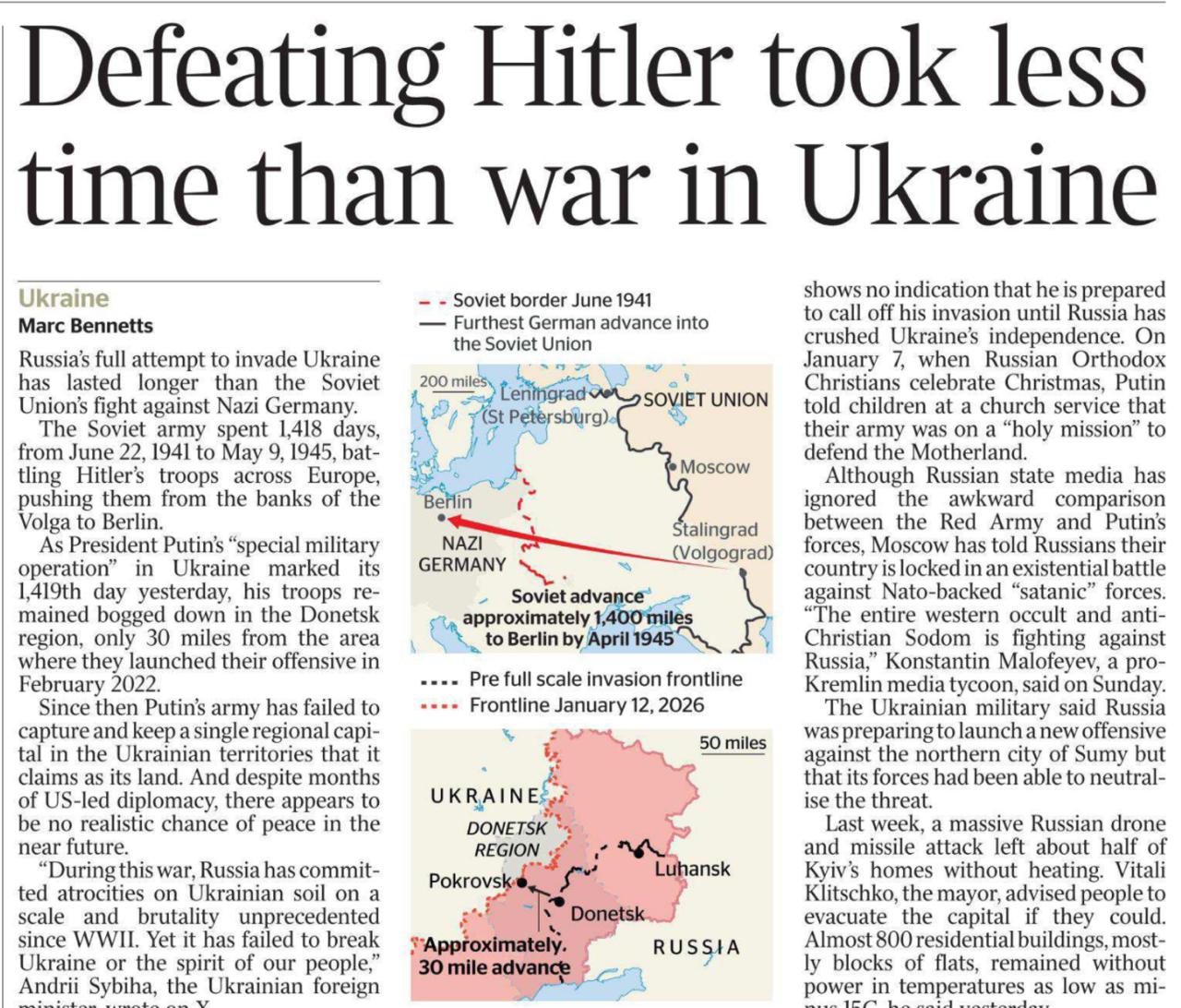 Практически вся европейская пресса дружно кинулась злорадствовать по поводу того, что СВО на Украине длится более 1418 дней. Ну чуть ли не все газеты в Британии вышли с заголовками: «Разгром Гитлера занял меньше времени, чем война на Украине».