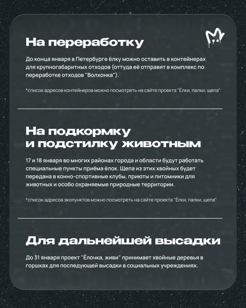 Ёлки на свалку после Нового года? Отнюдь — думаем о питерской экологии и вливаемся в тему переработки с пользой. Накидали вам варианты в карточках.