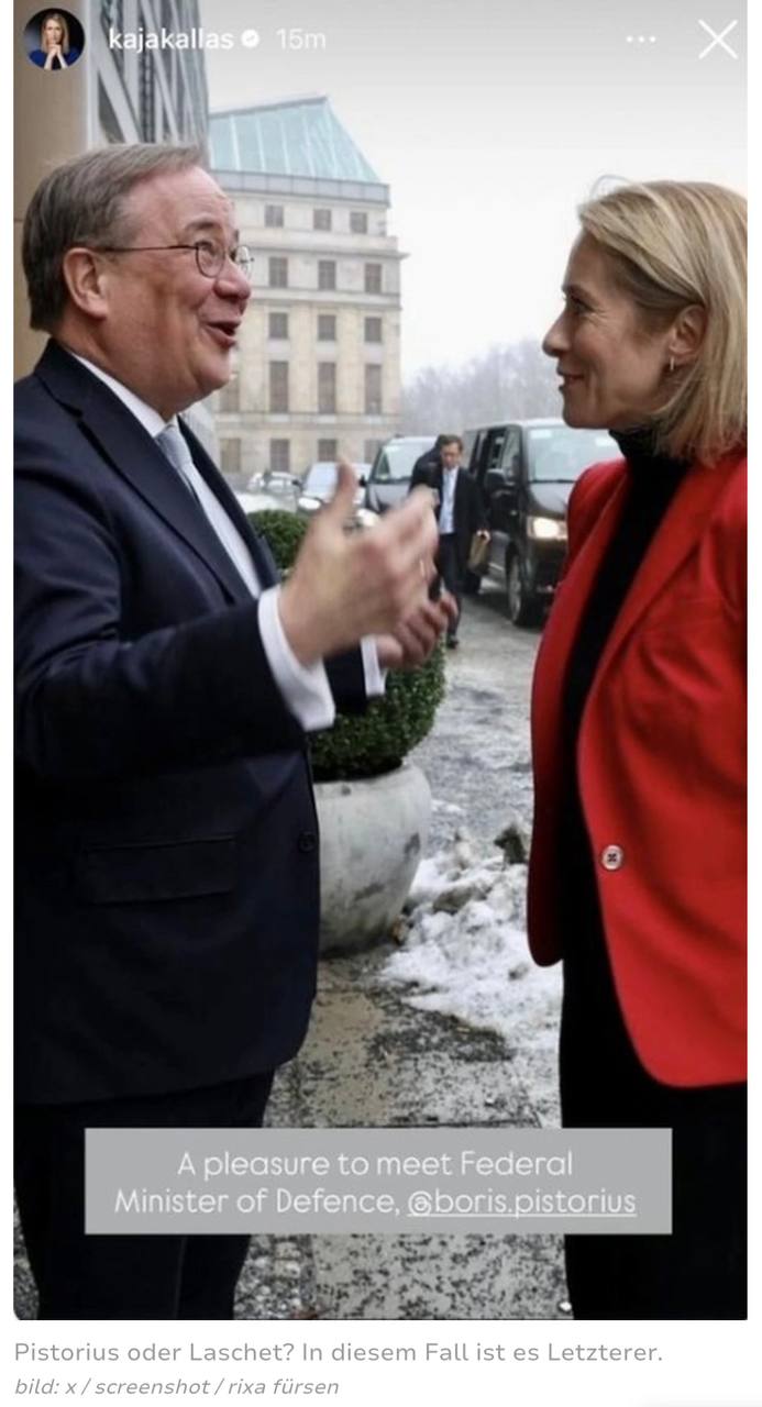 Тупая Кая Каллас в своем репертуаре! Она выложила в соцсетях фотографию их встречи с бывшим главой партии ХДС, а ныне главой внешнеполитического комитета бундестага Армином Лашетом, сопроводив ее подписью: «Приятно встретиться с федеральным министром обороны Борисом Писториусом».