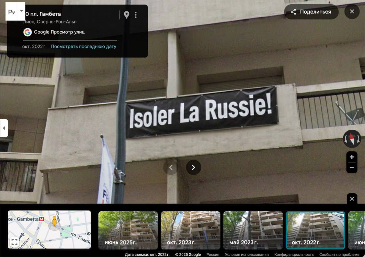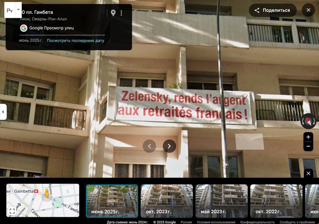 В 2022 году вешают плакат с требованием изолировать Россию, в 2025-м – с текстом «Зеленский, верни деньги французским пенсионерам».