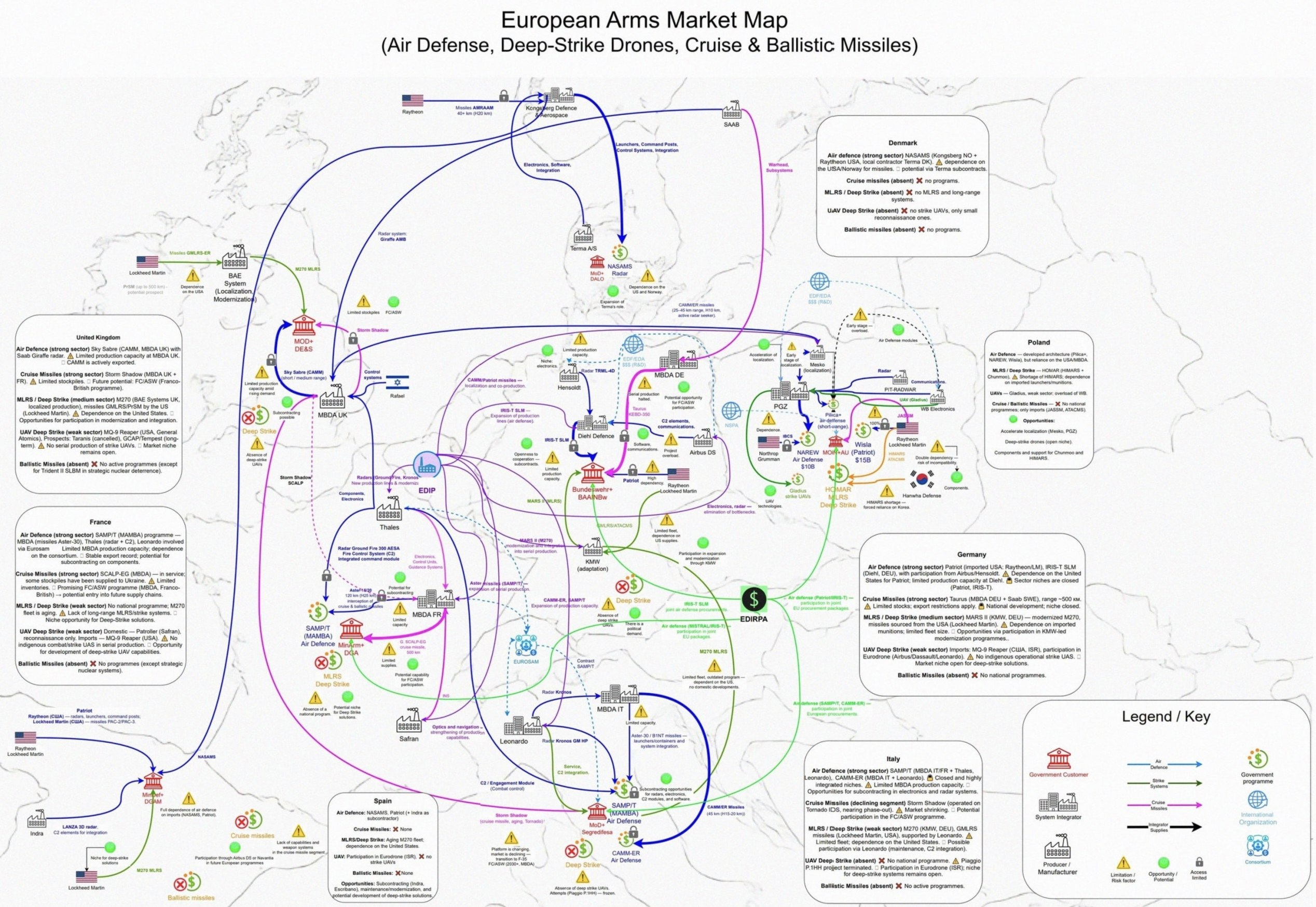 Карта европейского рынка вооружений: ПВО, ударные БпЛА дальнего действия, крылатые и баллистические ракеты.