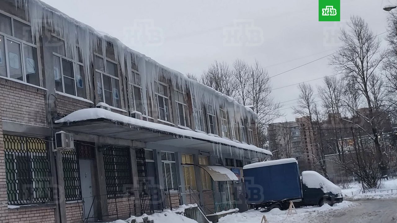 Эти сосульки могут претендовать на звание самых опасных и гигантских в Петербурге. Ледовые наросты образовались на отделении почты по адресу Белградская улица д. 26, к. 6.