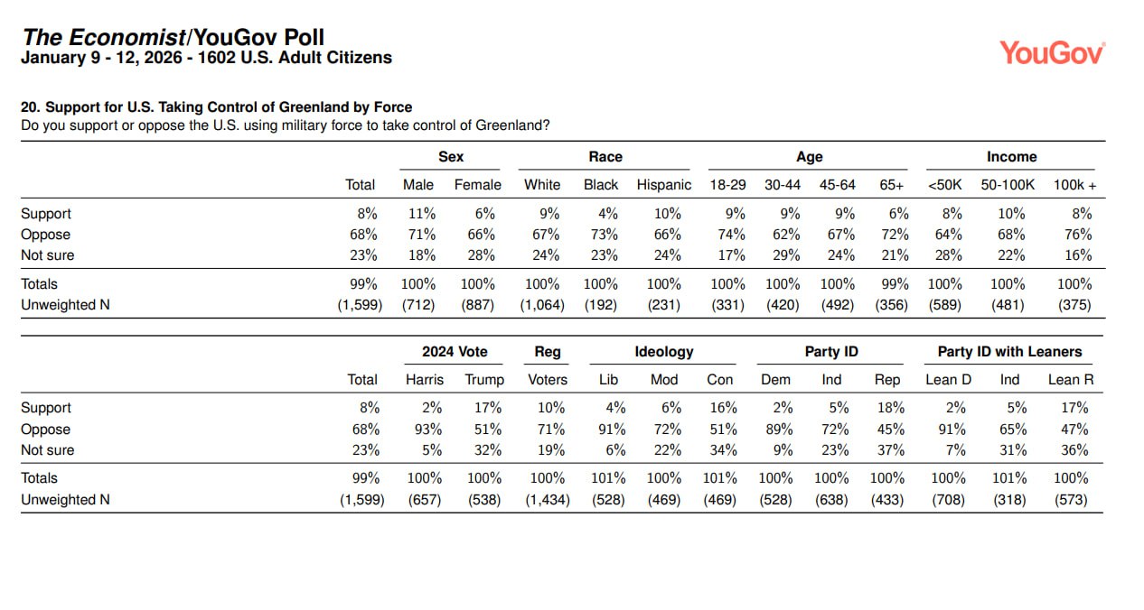 Американцы не хотят Гренландию. Согласно прошедшему на днях опросу YouGov лишь 8% поддерживает использование военной силы для того, чтобы установить контроль над ней, тогда как 68% выступают против.
