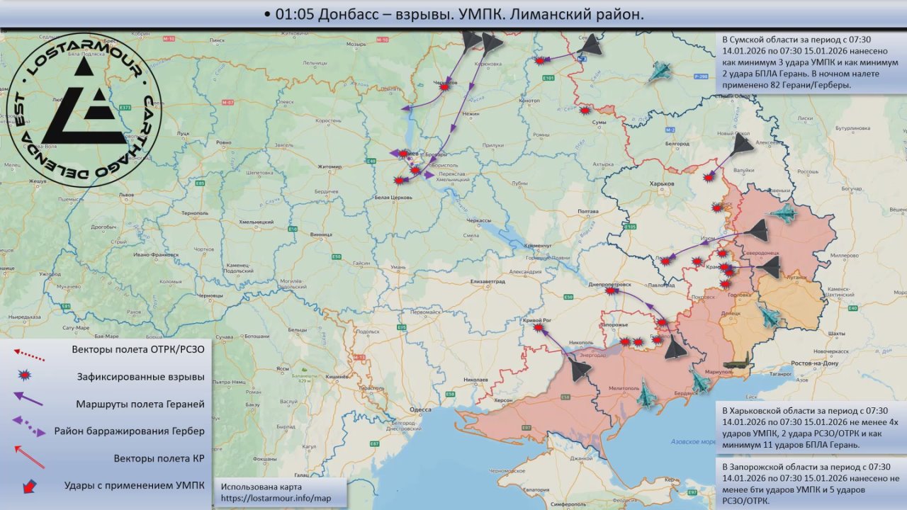 Анимированная схема ударов по территории Украины 14 января 2025 – 15 января 2026 года.