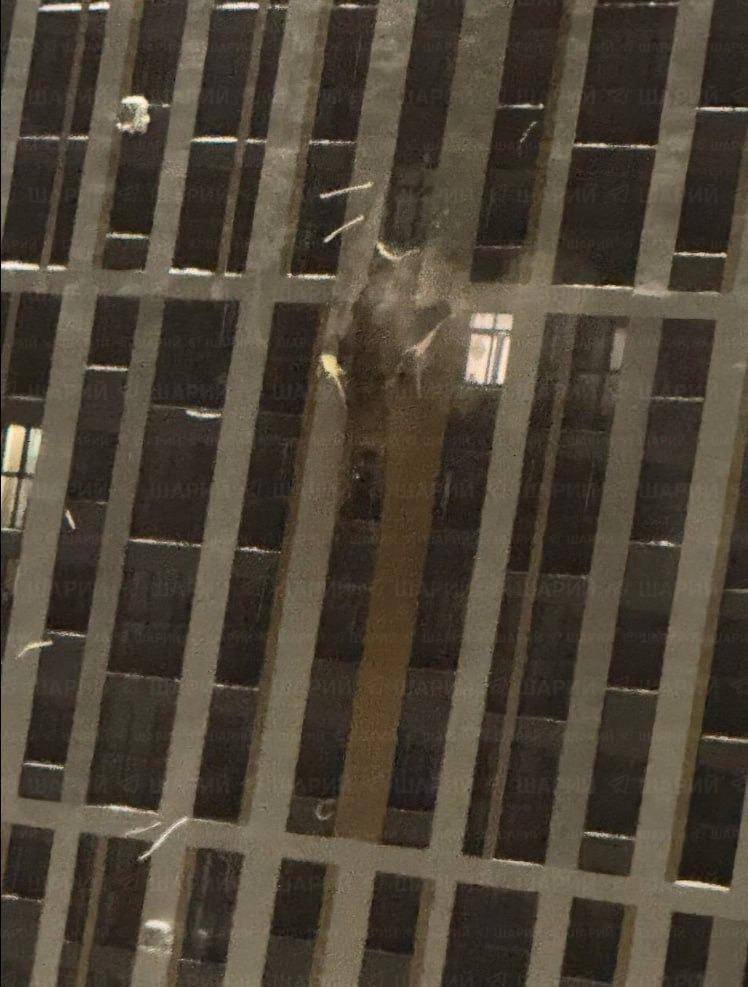 Последствия попадания дрона в многоэтажку в Рязани. Обошлось без погибших, у двух гражданских легкие ранения. Всего в Рязани сбили 22 дрона. Повреждены фасады 2 многоэтажек и 4 квартиры.