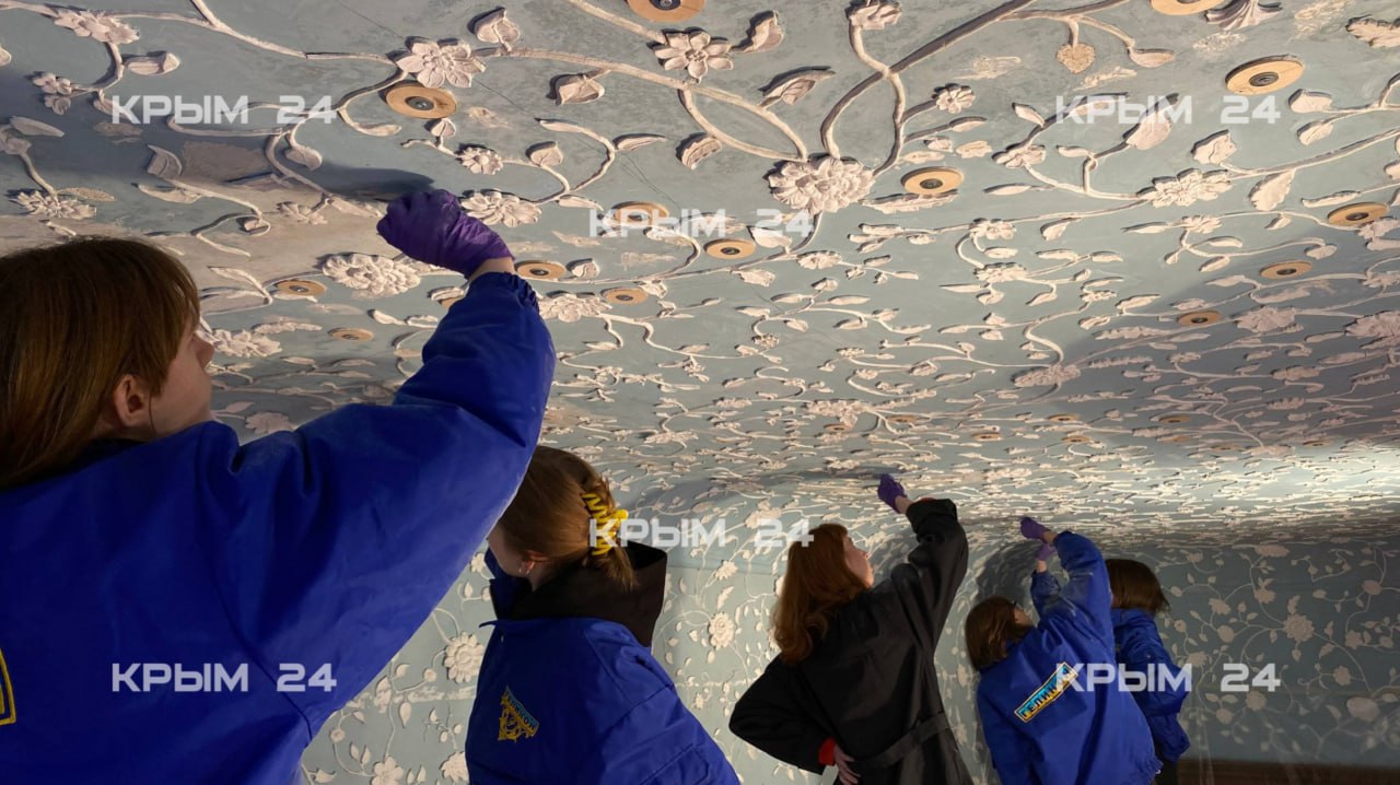 Специалисты из Санкт-Петербурга укрепляют и очищают штукатурный слой. Затем мастера приведут в порядок лепной декор на стенах и потолке зала.