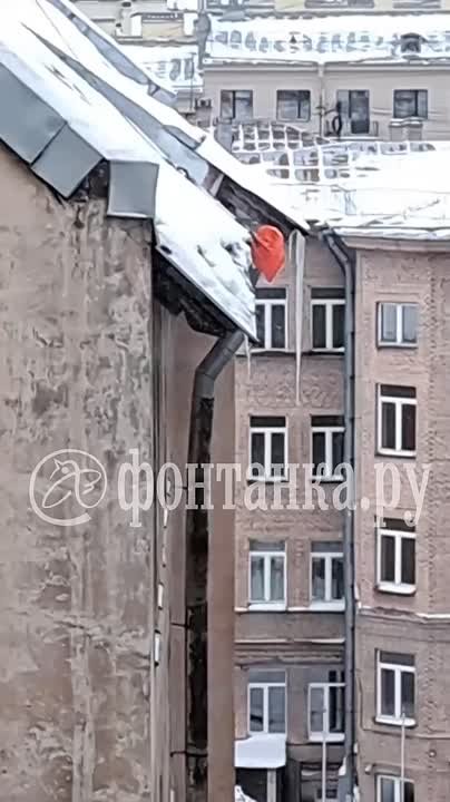 Скучали по утюгам и лопатам на верёвке? Вот такой «инструмент» нашёлся на крыше дома на Васильевском острове. Правда, оказался слишком хлипким — и к концу съёмки на верёвке болталась уже одна ручка...