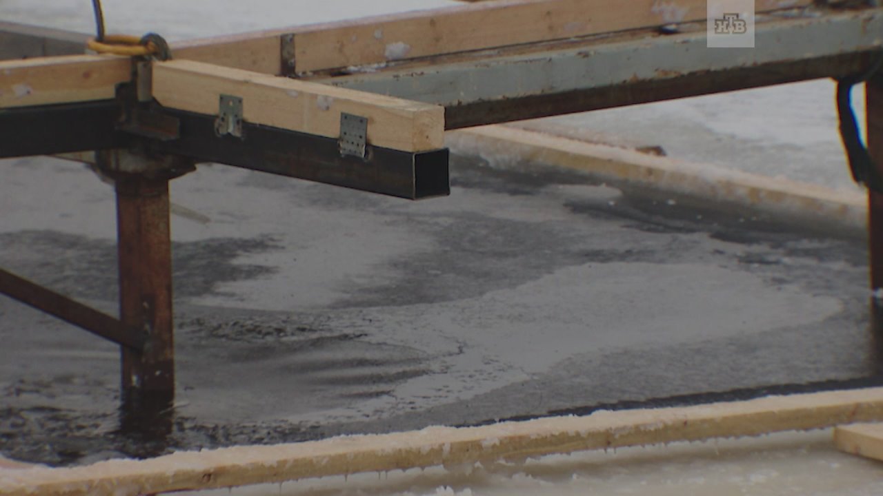 В Неве у Заячьего острова вырезали прорубь и установили в воде деревянную конструкцию.