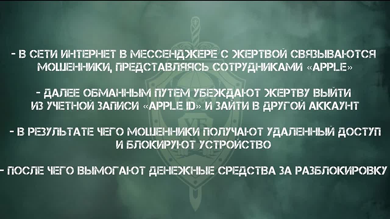 В сети Интернет в мессенджере с жертвой выходят на связь мошенники, представляющиеся сотрудниками «Apple». Далее обманным путем убеждают жертву выйти из учетной записи «Apple ID» и зайти в другой аккаунт. В результате чего мошенники получают удаленный доступ и блокируют устройство. После чего вымогают денежные средства за разблокировку учетной записи.